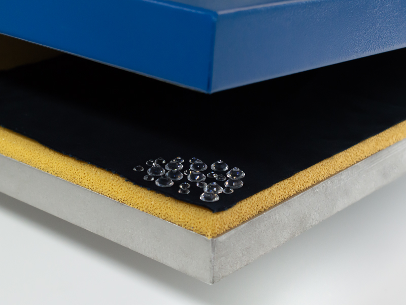 Silicone rubber foam soft yellow size: 100X130 cm , h.10mm suitable for the simultaneous application of materials with different thicknesses ess. ss34 with ss6. The softness of the foam lets the fabric to penetrate in the spaces that are created between a rhinestone and the other large.