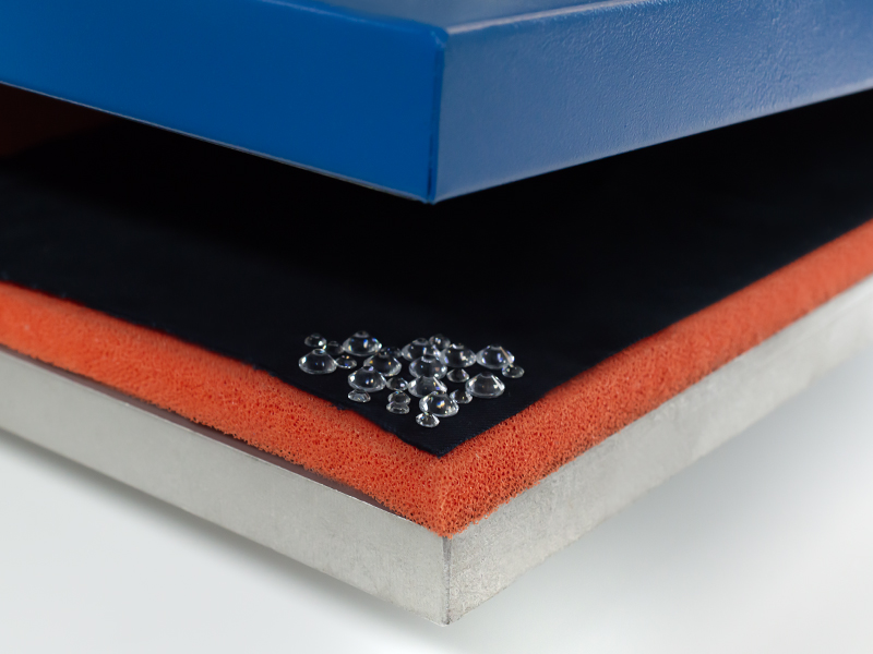 Silicone rubber foam ultra soft orange size: 100x130 cm , h.15mm suitable for the simultaneous application of materials with different thicknesses ess. ss34 with ss6. The softness of the foam lets the fabric to penetrate in the spaces that are created between a rhinestone and the other large.